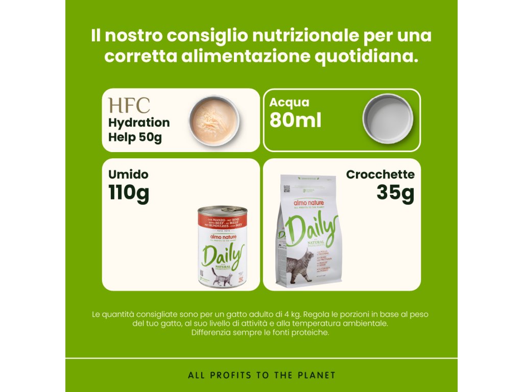 Almo Nature odporúča striedať ryby, červené a biele mäso a mokré a suché jedlá (granulky) v orientačnom pomere 60%, respektíve 40%. Nemiešajte suché a mokré, podávajte ich v samostatných jedlách/porciách/.