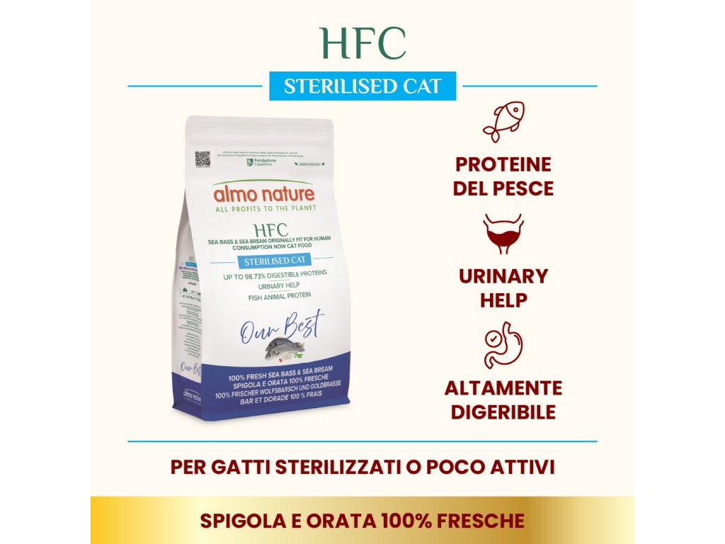 Všetky suroviny a čerstvé mäso je teda predurčené na ľudskú konzumáciu a teraz sa používa i pre štvornohých priateľov. HFC adult sterilized je vhodná pre dospelé sterilizované ale i pre dospelé mačky s protektivnou natural ochranou, urinary ciest. Almo Nature odporúča striedať ryby, červené a biele mäso, mokré a suché jedlá (granulky ) v orientačnom pomere 60%, respektíve 40%.