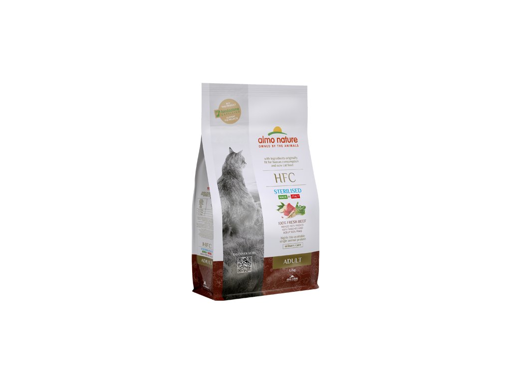Všetky suroviny a čerstvé hovädzie mäso je teda predurčené na ľudskú konzumáciu, ktoré sa použili pre našich štvornohých miláčikov. Mäso pochádza z voľne sa pasúceho hovädzieho dobytka. Mäso v BIO kvalite,nízky obsah horčíka na zníženie možnosti tvorby kameňov; mierny obsah tuku a primeraný prísun vlakniny. HFC adult sterilized je vhodná pre dospelé a sterilizované mačky. Almo Nature odporúča pestrú stravu (ryby, červené a biele mäso, mokré a suché jedlá, granulky v orientačnom pomere 60%, respektíve 40%).