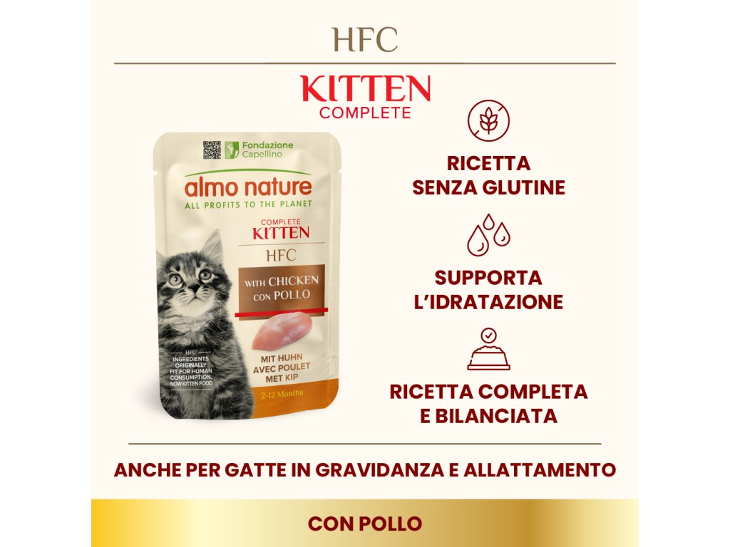 Čo je HFC? Sú to kvalitné potraviny určené na ľudskú konzumáciu = teraz použité pre prípravu stravy Vašej mačičky. HFC kitten natural - je najslávnejšia konzerva v Almo Nature vyrobená podľa tradičnej osvedčenej receptúry. Recepty HFC Natural kitten sú pripravované v jemnom vývare a vďaka nemu sú ideálne na prirodzenú hydratáciu tráviaceho traktu mačiatok, gravidných a dojčacich mačiek. Je plná kvalitných bielkovín, taurínu, minerálov a vitamínov... Prajeme dobrú chuť...