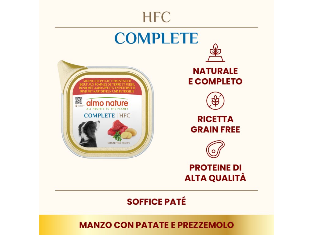 Vôňa a použité suroviny sú tak lákavé, že sa môže stať, že dostanete pokušenie sami ochutnať . Konzistencia je taká, že ide o paštétu zo štrukturou vlakniny a mäsa, ktorá je ideálna pre psy všetkých veľkostí. Použivané hovädzie mäso pochádza z Írska - plemeno Angus, z voľných chovov, ktoré sa voĺne a prirodzene pasú na večne zelených, nekonečne veľkých lúkach. Všetky použité ingredience sú prirodzene bez pridaných hormónov , antibiotík a GMO modifikací. Vďaka svojej bezobilnej receptúre, vysokému obsahu mäsa, surovinám potravinárskej kvality a šetrnej technológii patrí almo nature HFC do té najvyššej kvality. Almo Nature odporúča striedať KOMPLETNÉ mokré jedlo a granule, aby sa podporilo hryzenie pre zuby a trávenie. Všetky produkty Almo Nature HFC Dog Complete neobsahujú obilie.