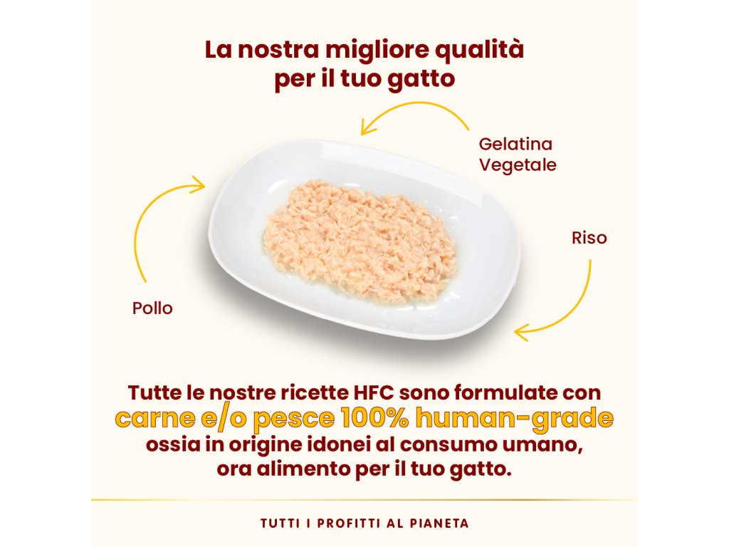 Naše výrobky neobsahujú žiadne chemické konzervačné látky (BHA, BHT), umelé príchute, farbivá ani látky určené k aromatizácii. Jednoducho a zdravo varené v bujóne alebo v bain-merie sú vlhké prípravky HFC ideálne pre prirodzené zvlhčenie vašej mačky a to vďaka jej bohatému vývaru.