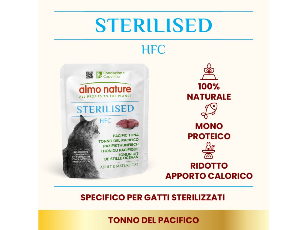 HFC cat sterilised je rada receptúr v ktorom je jednoznačná identifikácia pôvodu zložiek v receptúre. To zaručuje Vašej mačke to najlepšie na príjem živočíšnych bielkovín pre správnu vyváženosť stravy a psychofyzickú pohodu. Všetko je upravené na pare s cieľom ochrany a zachovanie nutričných hodnôt a vôní.