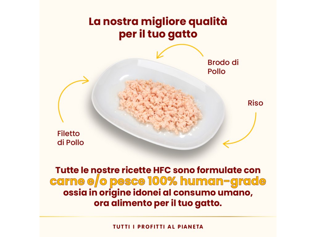 HFC cat vysoká palatabilita. Produkt, ktorý obsahuje vše od prírody . Vysoký podiel mäsa , obsahuje mäso, rýžu určené pre ludí a teraz použité ako potrava pre mačky. Naše výrobky neobsahujú žiadne chemické konzervačné látky (BHA, BHT), umelé príchute, farbivá ani látky určené k aromatizácii. Jednoducho a zdravo varené - je to dar od prírody.